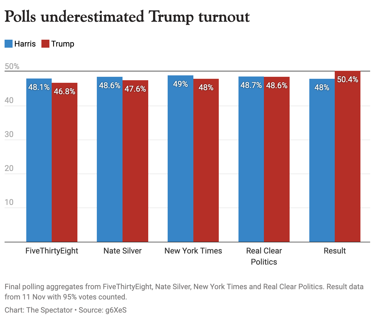 Another issue was the failure to estimate just how well Trump would get his vote out. The final poll aggregates from FiveThirtyEight, Nate Silver, the New York Times and Real Clear Politics all overstated Kamala Harris’s vote share while significantly underestimating Trump’s – highlighting the bias in the underlying polls.