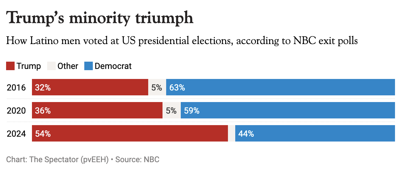 Pollsters seemed to miss the shift of Latino voters coming out for Trump too – after missing the white vote in the previous two elections. Having won roughly a third of the male Latino votes in 2016 and 2020, an exit poll for NBC suggests Trump took over half that vote this time.