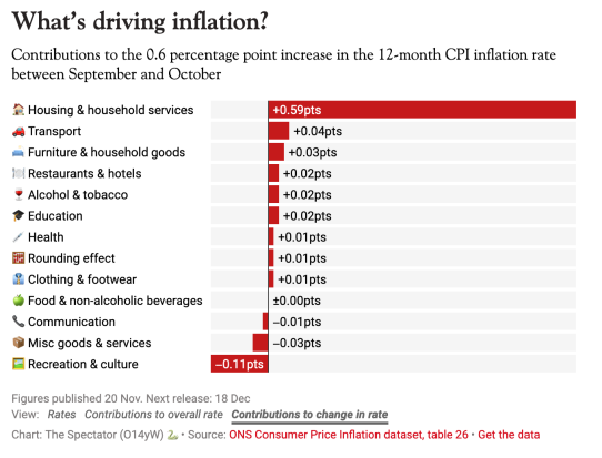 One figure Bank of England rate setters follow keenly is the rise or fall in the costs of services. This can be more a reliable input when judging economic heat because it tends to be less volatile than the price of food or energy. But in the year to October service inflation rose unexpectedly from 4.9 per cent to 5 per cent.