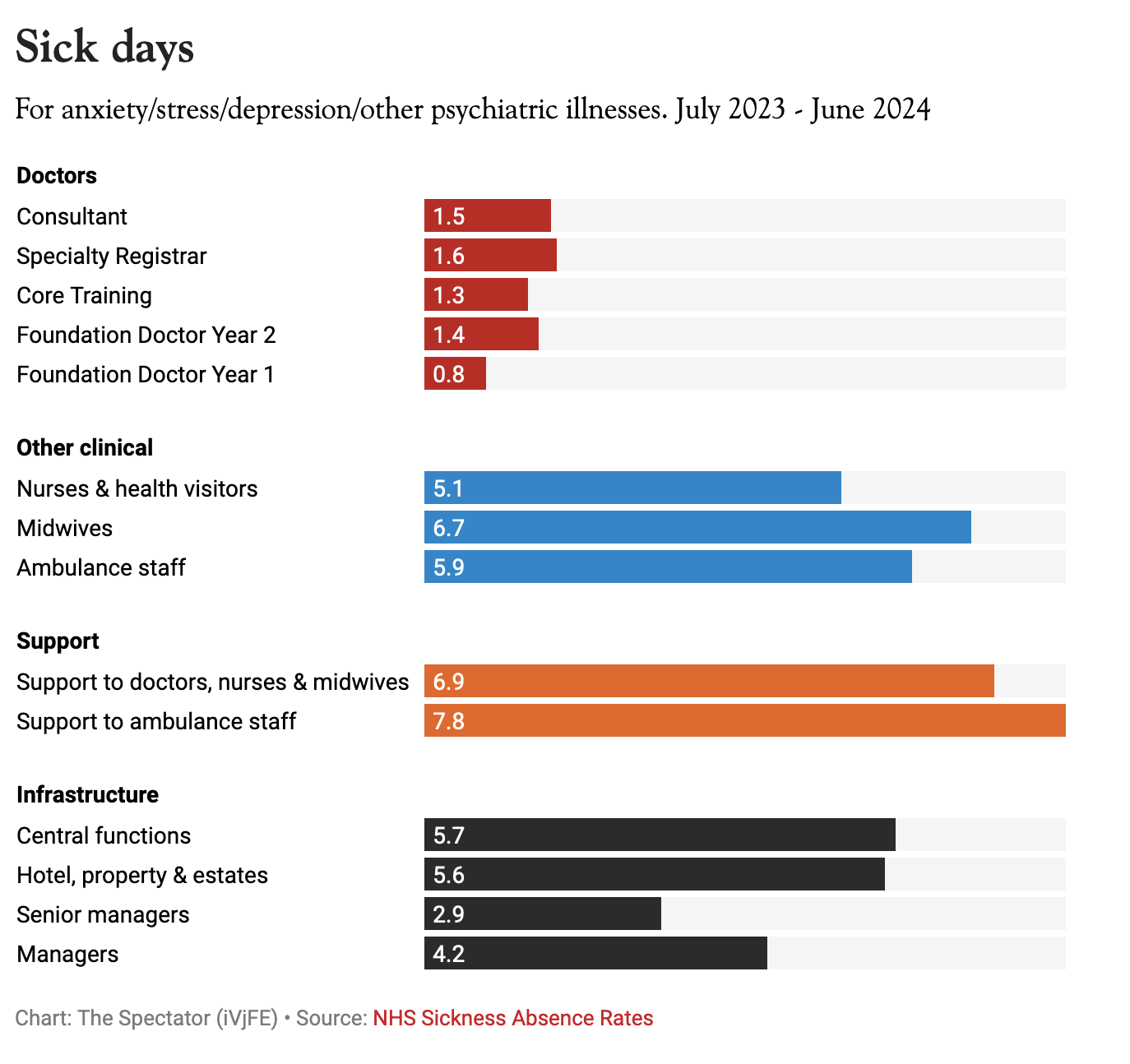 Further down the hospital hierarchy, the picture changes. Nurses, midwives, and ambulance staff – those who interact the most with patients – bear the brunt of the NHS’s mental health crisis, taking off more than a week per year on average.