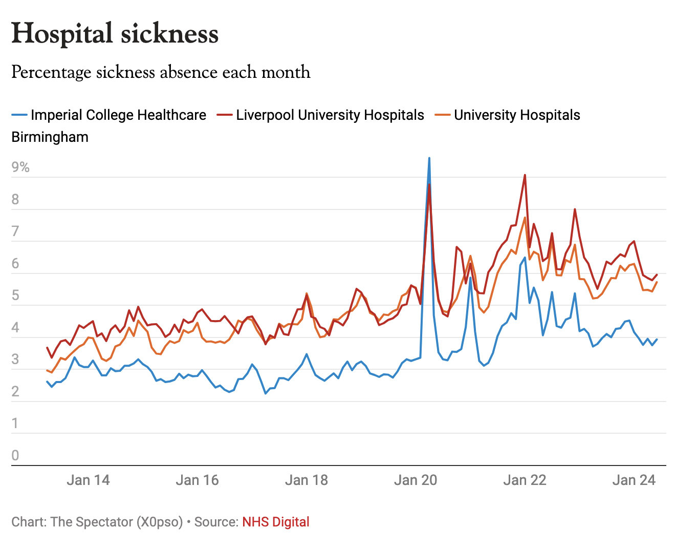 Some £22 billion of the £40 billion in tax rises the Chancellor announced this week will go straight to the NHS – an NHS that was already better funded than at any point in its history. It seems that no matter how many cash injections – huge or enormous – the health service gets, its problems continue. Could staff sickness be part of the problem? I’ve crunched the numbers for The Spectator’s data hub and this is what I found.