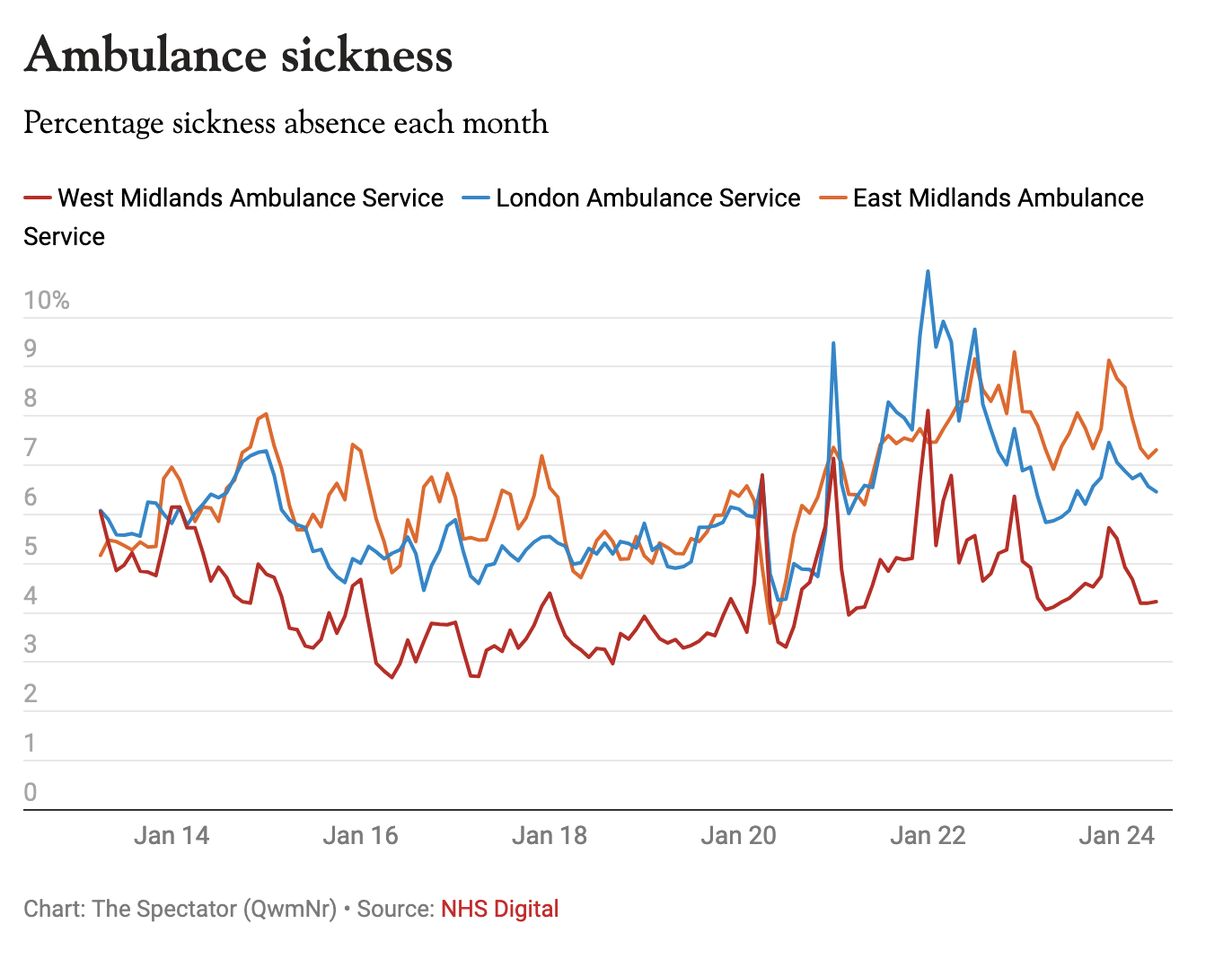 The same trend appears here. While the pandemic shook up everything, West Midlands Ambulance has consistently maintained a lower absence rate – around 50 per cent less than their counterparts in London or the East Midlands.