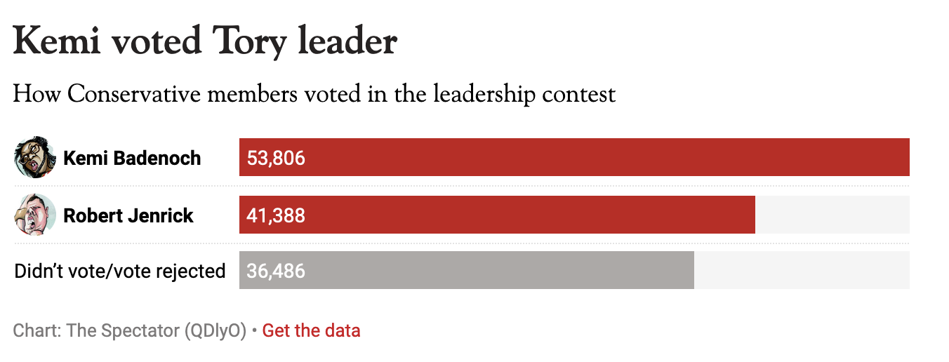 Those of us who have followed her rise these past few years are already well versed in the Kemi brand. As she recently told Sky’s Sophy Ridge: ‘I’m very blunt, very forthright. I’m very confident as well. I’m not a wallflower.’ Yet polling conducted just three months ago by BMG Research found that only 49 per cent of the electorate had even heard of her (though this still placed her seven points ahead of Jenrick).