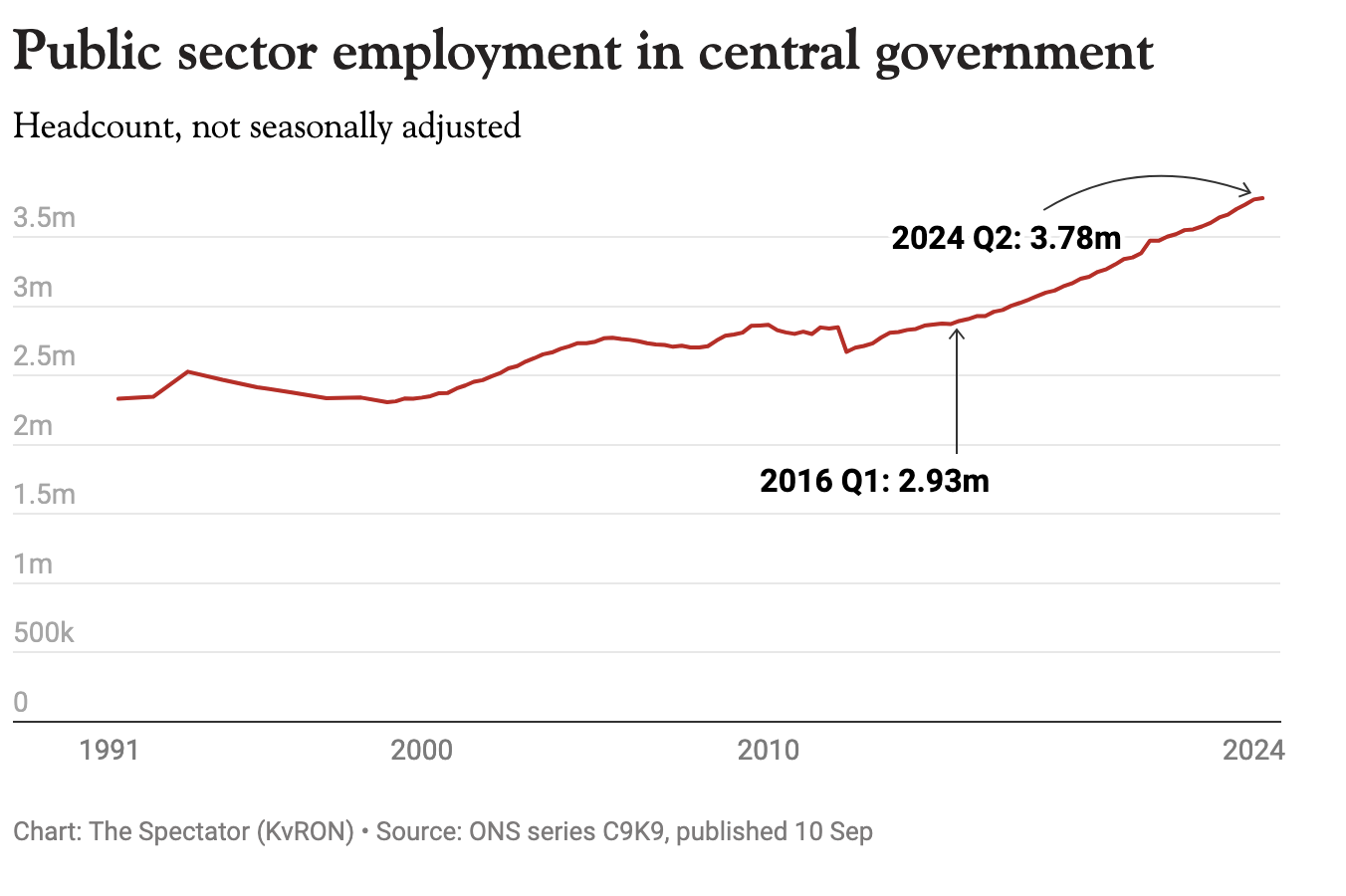 It would be little wonder if the civil service can do in four days the work it used to do in five: its numbers have exploded in the past decade. In 2016 we had 2.9 million civil servants employed by central government; now we have 3.79 million. True, you can argue that we needed more administrators during the Brexit process and again during Covid, but both those things are over now. And yet the number of civil servants has continued growing. What are they are all doing that the civil service was not in 2016? This a period, of course, in which technology ought to have aided productivity by cutting out the human element in many cases.