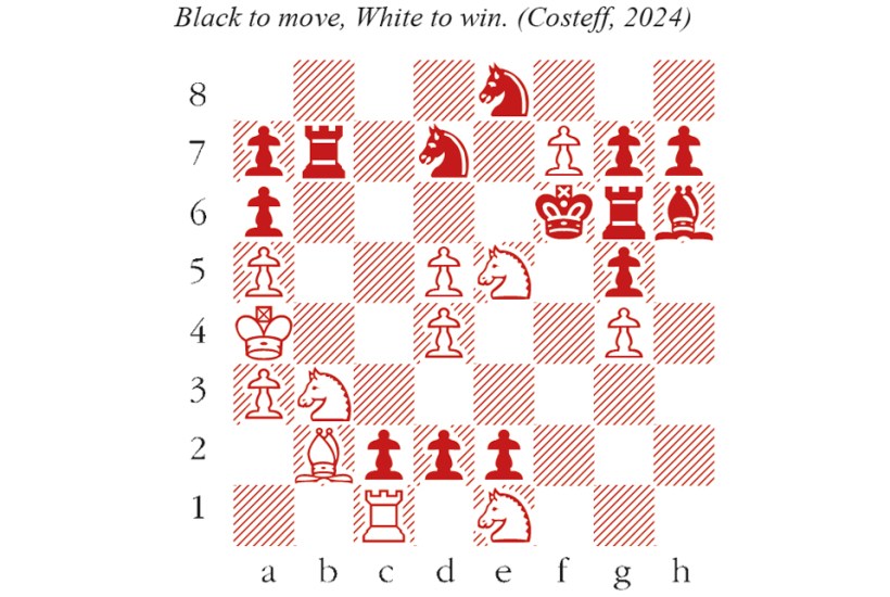 In recent weeks, a new composition has appeared which realises that dream, composed by Gady Costeff. White is to win, but unusually for a problem, Black moves first (see diagram).
