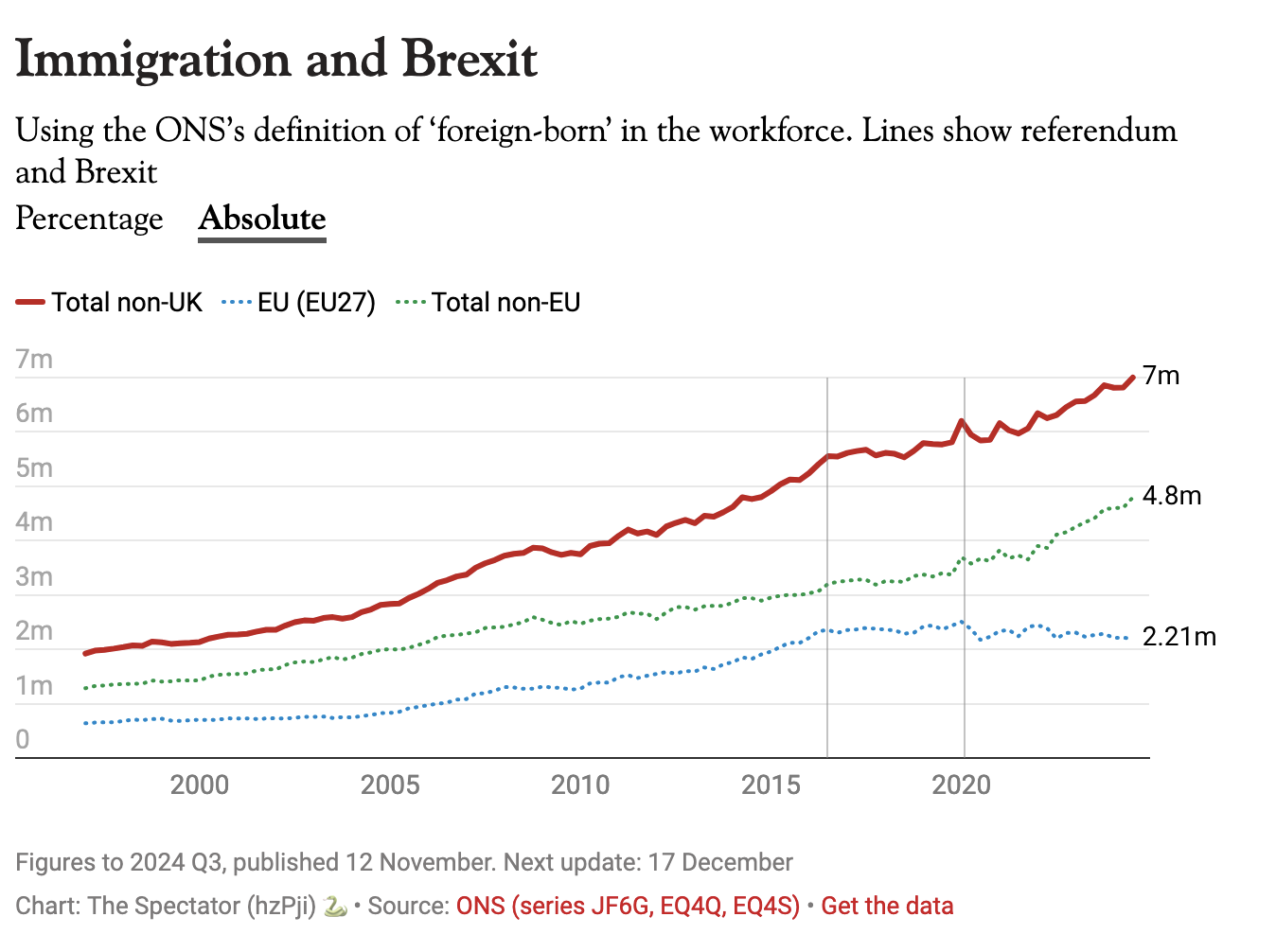 For the first time ever there are seven million migrant workers in Britain’s job market. Figures released by the ONS this morning show that more than one in five jobs in Britain is now filled by someone born overseas – despite a fall in EU workers since Brexit. Overall, that’s an increase of 183,000 – equivalent to a town the size of Warrington or a city the size of Southend – since the election, and up over one million since the first lockdown.