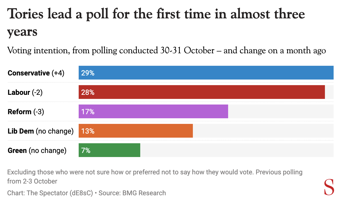 It’s Rishi Sunak’s final week as Tory leader, but should he be asked to carry on? On Wednesday he charmed the Commons at PMQs before stealing Rachel Reeves’s thunder with a virtuoso Budget speech. And now, in the final poll of his leadership, it transpires that the Conservatives have, at long last, overtaken Labour in the polls. Autumn election anyone?
