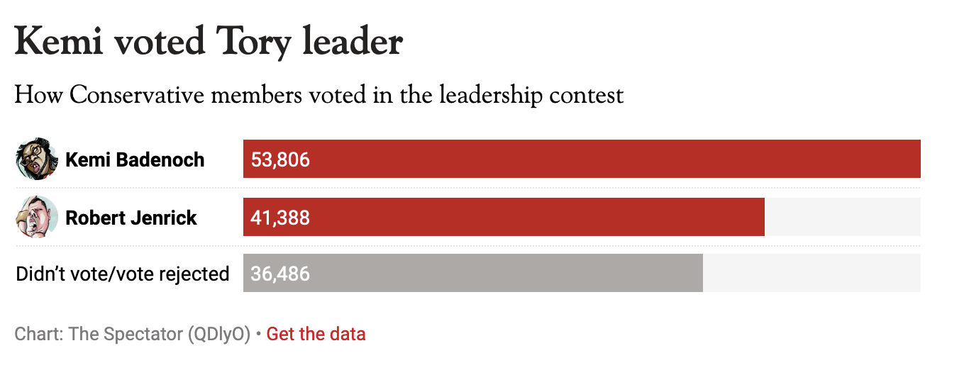 The results of the Conservative leadership contest are in. Almost four months after the Tory party suffered its worst general defeat in its history, Kemi Badenoch has been crowned as the party’s new leader. Badenoch won 53,806 votes to Robert Jenrick on 41,388 – the turnout was 72.8 per cent, down on the 2022 contest which saw a turnout of 82.2 per cent.