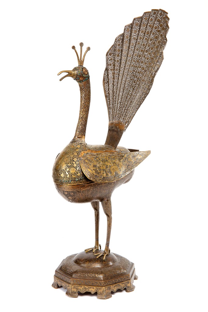 A brass incense burner in the shape of a majestic peacock, c.1870, from Qajar Iran. © The Society of Antiquaries of London (Kelmscott Manor)