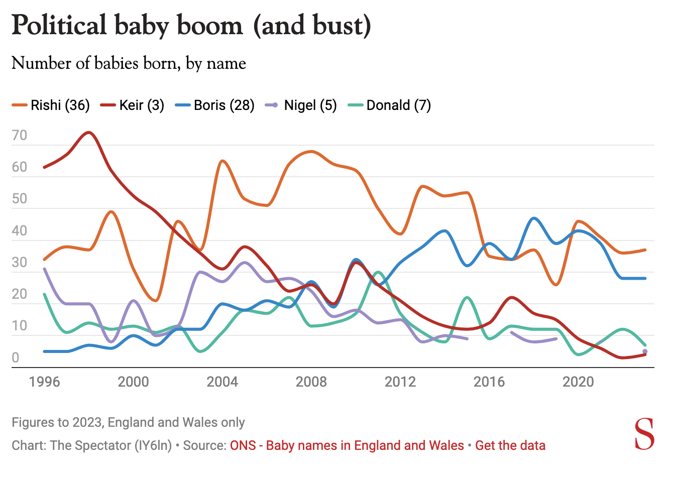 ‘Rishi’ kept his place at the political names top spot, going from 36 babies last year to 37 thus year. ‘Boris’, perhaps surprisingly, held strong too, keeping level at 28. ‘Keir’ languished around the count of three, where ONS statisticians suppress the results if less than three babies are given that particular name. Having suffered that humiliation last year, ‘Nigel’ crept back above the cut-off though, with five being born. Perhaps Farage will start a comeback.