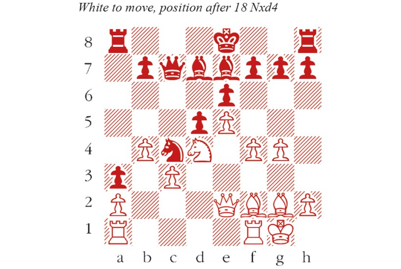 1 e4 e6 2 d4 d5 3 Nc3 Nf6 4 e5 Nfd7 5 f4 c5 6 Nce2 Nc6 7 c3 a5 Mysteriously, Ding spend almost half an hour on this move, which is strategically well known but a rare choice in this exact position. 8 Nf3 a4 9 Be3 Be7 10 g4 Qa5 11 Bg2 a3 12 b3 cxd4 13 b4 Qc7 14 Nexd4 Nb6 15 O-O Nc4 16 Bf2 The strong knight outpost on c4 gives Ding good prospects. Gukesh would love to attack with f4-f5, but the weak e5 pawn makes that hard to accomplish. Bd7 17 Qe2 Nxd4 18 Nxd4 Nb2! (see diagram) This cheeky jump opens avenues for the black pieces. 19 Qe3 Rc8 20 Rac1 Qc4 21 f5 Qd3! With weak pawns on a2, c3 and e5, Gukesh can ill afford an exchange of queens. Now if 22 Qf4 g5! 23 fxg6 (en passant) Qxg6 there is no good answer to the various threats of Nb2-d3 and Be7-g5. 22 Qe1 Bg5 23 Rc2 Rc4 Threatening Rc4xd4. 24 h4 Bf4 25 Qb1 Rxc3 26 Rxc3 Qxc3 27 fxe6 fxe6 28 Ne2 Qxe5 29 Nxf4 Qxf4 30 Qc2? 30 Bc5! was worth a try, to prevent castling. After 30…Qxg4 31 Qxh7 brilliantly aims for mate with Rf1-f8#, but is refuted by 31…Qd4+! deflecting the bishop. However, 31 Rf3! preparing Qb1-f1, would yield real chances. Qc4 31 Qd2 O-O 32 Bd4 Nd3 33 Qe3 Rxf1+ 34 Bxf1 e5! Now Ding is two pawns up for no compensation. 35 Bxe5 Qxg4+ 36 Bg2 Bf5 37 Bg3 Be4 38 Kh2 h6 39 Bh3 Qd1 40 Bd6 Qc2+ 41 Kg3 Qxa2 42 Be6+ Kh8 Now 43 Qxe4 Qf2+! wins so White resigns