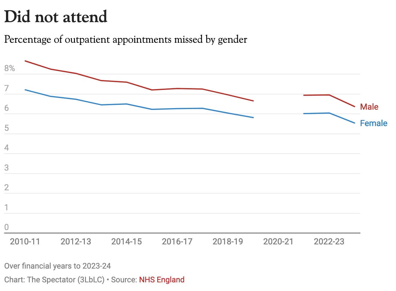 On the surface the data looks like a success story for the NHS, with the percentage of appointments that patients miss gently falling over the last decade.