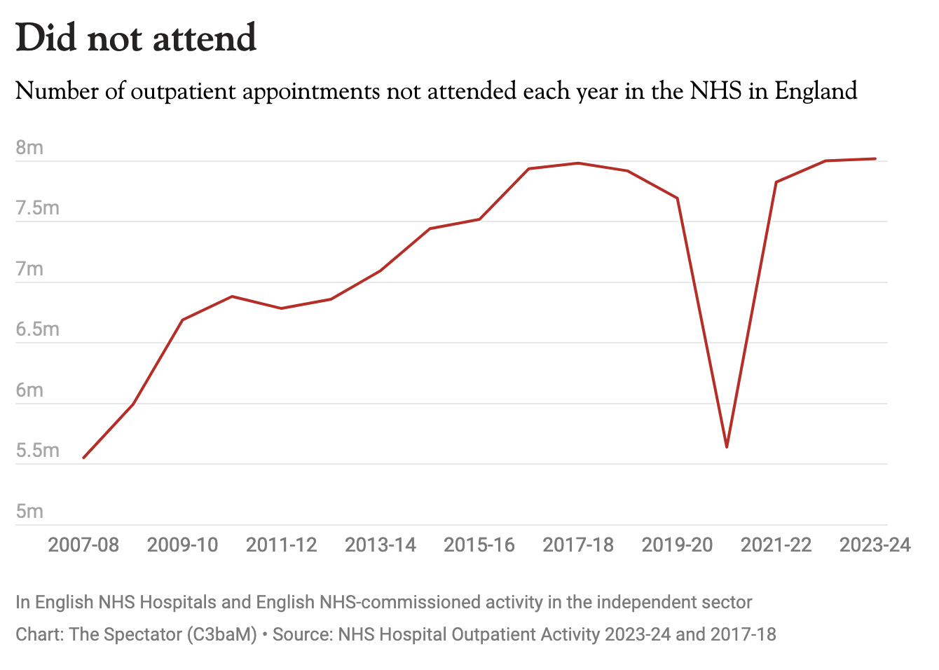 Unfortunately, like most of our health service, the figures are running to stand still and not even achieving that. Although the percentage missed has fallen, the number of appointments overall has ballooned by 20 per cent. What was fewer than 7 million missed appointments in 2010 has grown to more than 8 million in the last year.