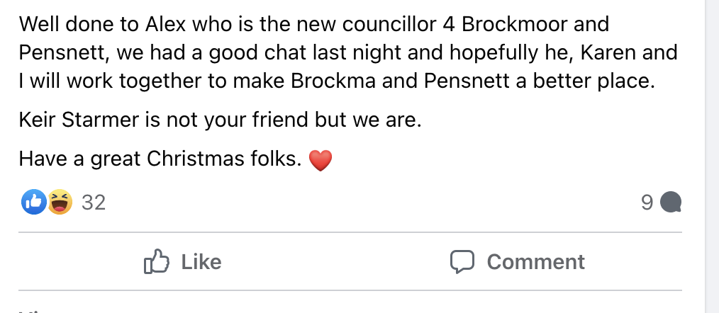 Such is the anger of the local Labour group at the loss of this seat that one of Karen Jordan’s colleagues has now taken to social media to vent his displeasure. Councillor Steve Edwards, who is one of the three councillors in Brockmoor and Pensnett, wrote on Facebook that on the doorstep the ‘overriding message’ is ‘anti Starmer and rightly so. Keir Starmer’s attack on the working class, our children and parents/grandparents is unjustifiable.’ He added that: