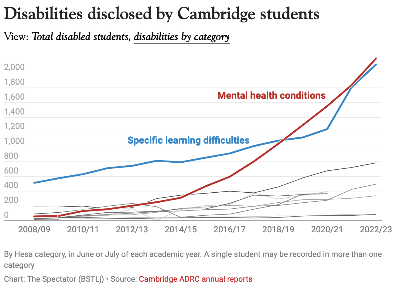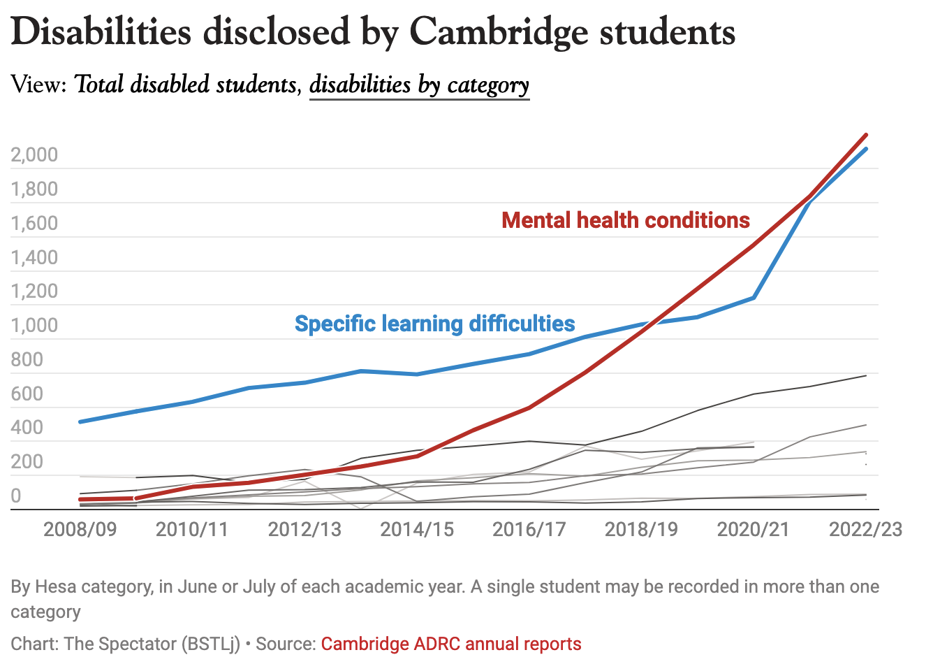 These changes reflect a bigger shift: for various reasons declarations of disability have spiked dramatically. Over the past 15 years, disability at Cambridge has increased more than fivefold, and is now declared by some 6,000 students (roughly one in four). The two major areas of growth have been ‘mental health conditions’ and ‘specific learning difficulties’. Many students register anxiety as the cause, yet the university and the NHS have neither the bandwidth nor the incentive to stress-test the claims. In four years, the number of students with ADHD has doubled, and is now approaching a thousand. As a result, the university’s Accessibility and Disability Resource Centre has gone into overdrive, mandating changes in teaching and examination across the board.