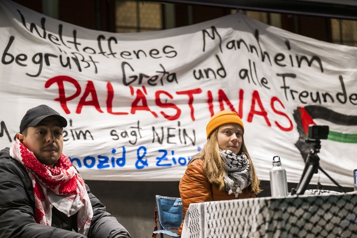 ‘F-ck Germany … and f-ck Israel!’ giggled climate mascot Greta Thunberg from behind a lectern draped in a keffiyeh while wearing another one around her neck.