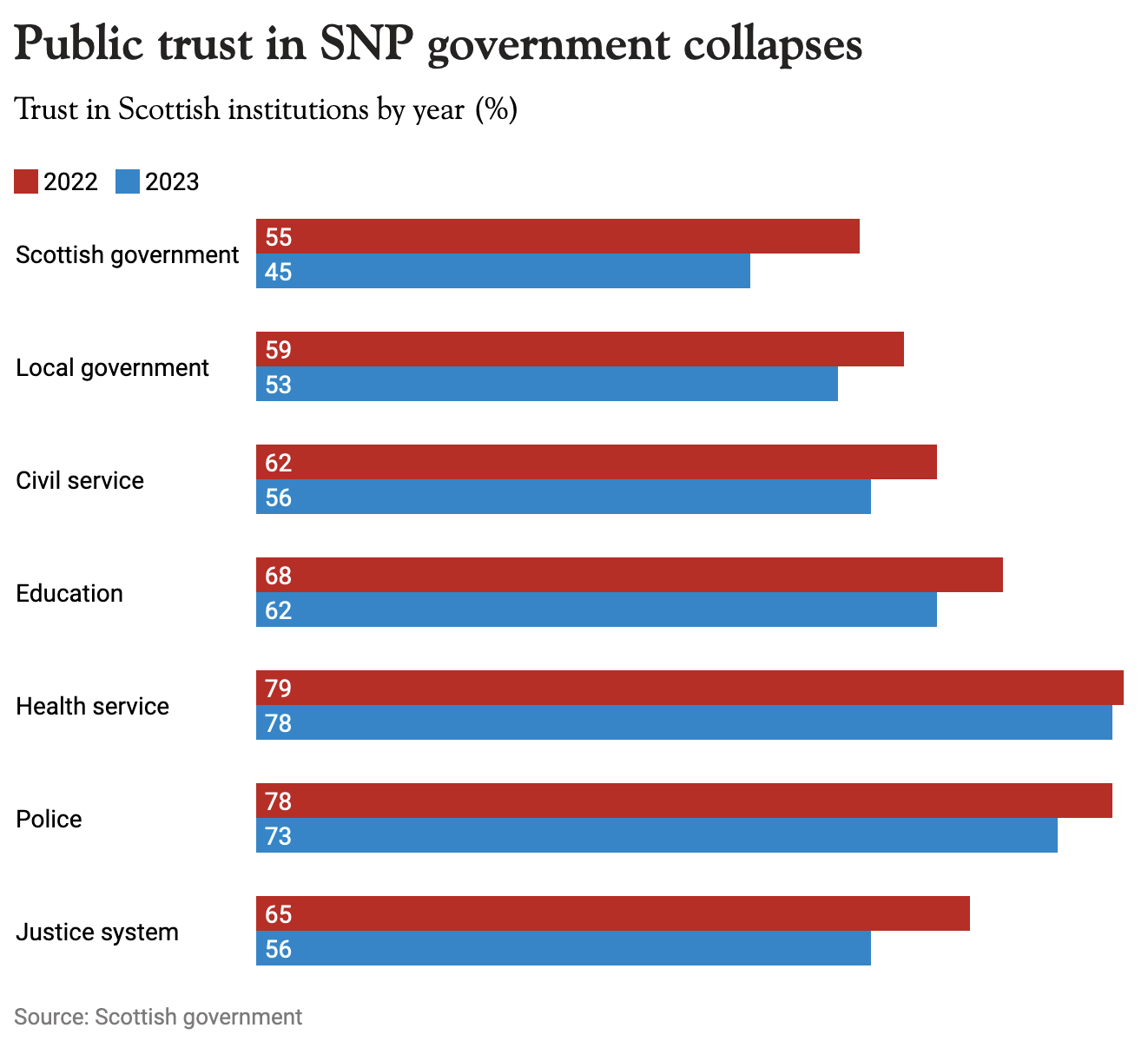 When it rains for Scotland’s Nats, it pours. It now transpires – according to the Scottish government’s very own survey – that between 2022 and 2023, the proportion of people who trust the SNP government has plummeted by a staggering 10 points. And that’s not all. Trust in all six public sector institutions has declined markedly in the last 12 months, with the results presenting a rather concerning picture for the SNP ahead of the 2026 Holyrood elections. Not that Mr S can say he’s particularly shocked…