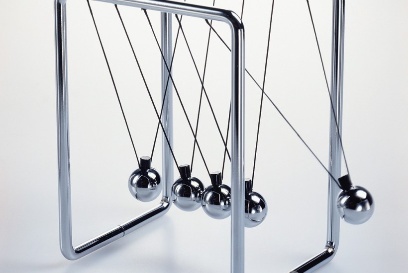 The Loncraine world view was announced to the public at Harrods’s Way In department, described as ‘trendy’. Here, in 1967, an early Loncraine business called Clever Designs showed a toy called Ballrace. This was Newton’s Cradle, sometimes nicely known as Newton’s Balls. It is a desktop demonstration of the third law of motion, perhaps the only demonstration of such a thing available in Harrods. Five adjacent metal balls are suspended by string from a frame. One end ball is raised and then released to strike the others. The three intermediate balls do not move, but the ball at the opposite end arches dramatically into space, demonstrating the conservation of energy and the existence of pressure waves. Greatly, one imagines, to the relief of the frazzled executive.