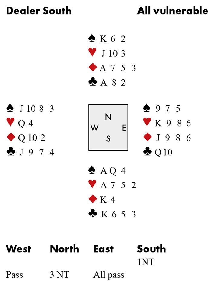 This is not the best play though – not by far! The best chance lies in playing West for at least one honour in Hearts, which he will have about 75 per cent of the time. Lead up towards the Jack, ten in dummy twice, and nine tricks are easy!