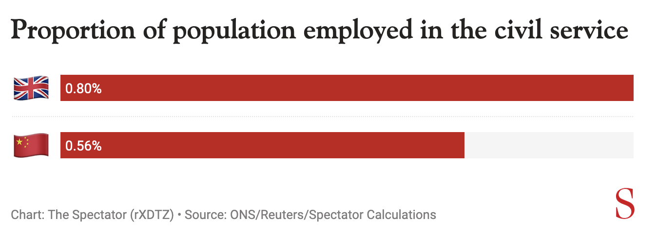 Let’s take China first. Making an estimate of China’s civil service is notoriously difficult, with various national statistics combining different bureaucracies and private and public sector workers. The Communist Party of China doesn’t have form when it comes to government transparency. If we take the Reuters figure at face value though, and combine it with China’s population of 1.42 billion, that works out as 0.56 per cent of the Chinese population working as a civil servant.