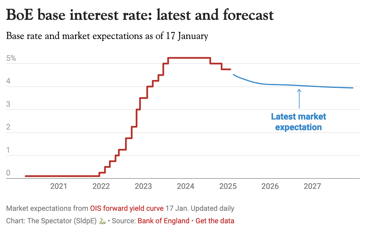 Perversely, the Bank will be more pleased with the rest of the ONS’s release which point to a seriously slowing labour market. Both methods of counting how many people are working (tax data and an ONS survey) found there to be fewer workers in the economy than in the previous quarter. Unemployment rose over the same period, and on last year, and now sits at 4.4 per cent. This news will likely prompt the Bank to pay less attention to wage data and proceed with an interest rates cut. Indeed, early moves in the markets in response to the data suggest a 90 per cent chance of a 25 basis point cut at the Bank’s February meeting — though cuts slow after that point.
