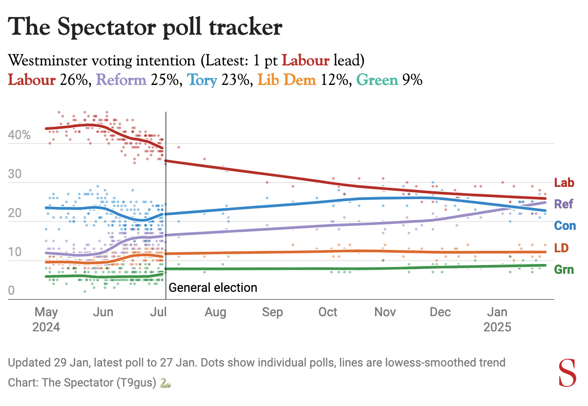 Several likely consequences flow from this. First, overseas examples of radical system change are liable to have a heightened capacity to reshape the preferences of the British public. The Trump administration in the US is the most obvious example but any regime in any major country, from Argentina to Italy, that does things differently and well is liable to have an impact. Secondly, the UK system is more wide open than ever before to a domestic insurgent force. And indeed, the rise and rise of Reform is the most notable trend in UK politics since Rishi Sunak fired Suella Braverman and hired David Cameron in his ‘Daddy’s Home’ centrist cabinet reshuffle of November 2023. Nigel Farage returning to the fray put rocket boosters under a process that was already under way. The Spectator‘s poll tracker currently has Reform averaging 25 per cent, splitting the traditional twosome and within reach of an outright lead.