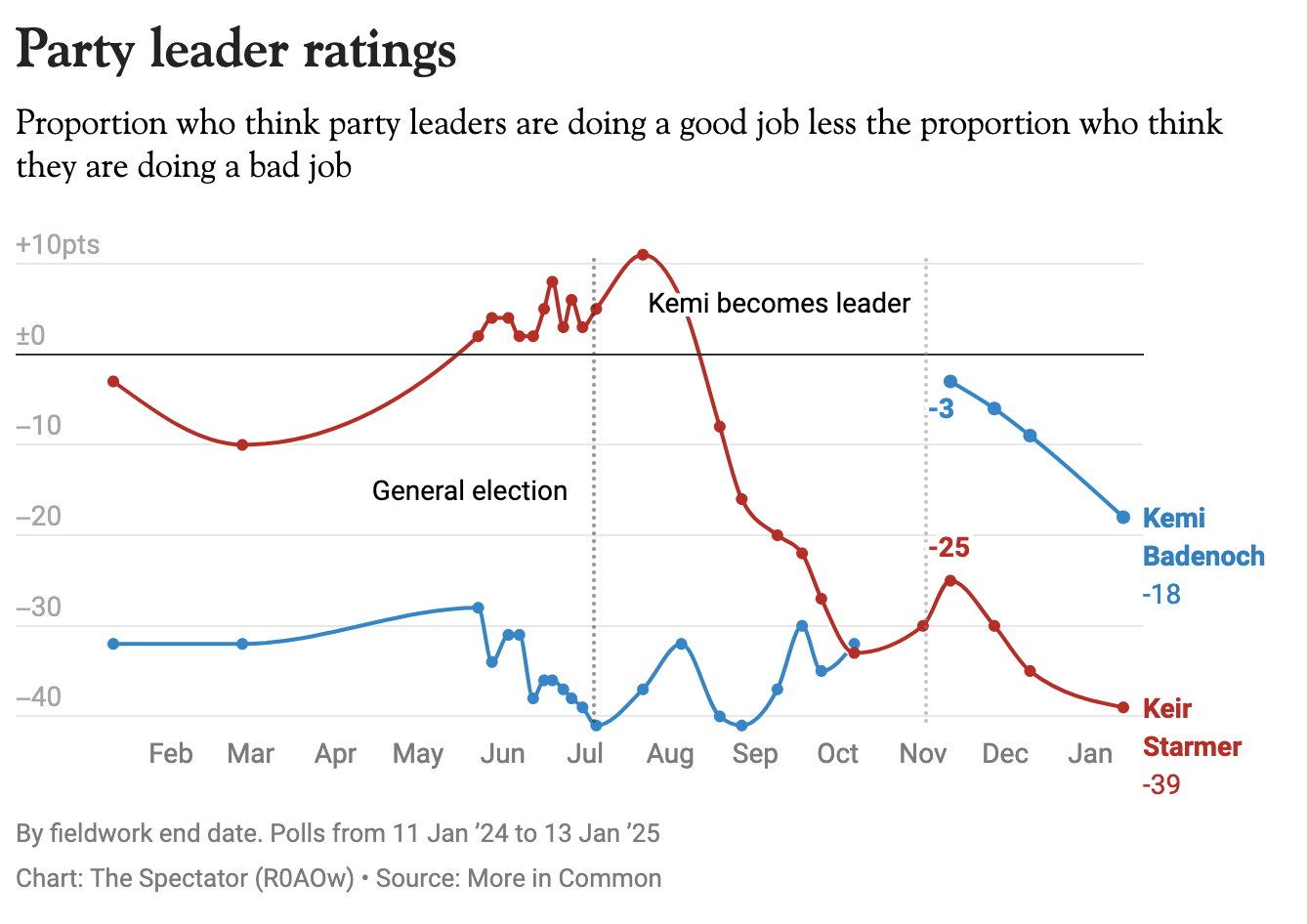Uh oh. Labour’s first six months in government haven’t gone quite as swimmingly as Sir Keir Starmer might have hoped and poll after poll has reflected the growing dissatisfaction with the incumbent government. The latest data dump– by pollsters More in Common – now reveals that the Conservatives are leading Labour by a point, with a quarter of Brits backing Kemi Badenoch’s boys in blue. How very interesting.