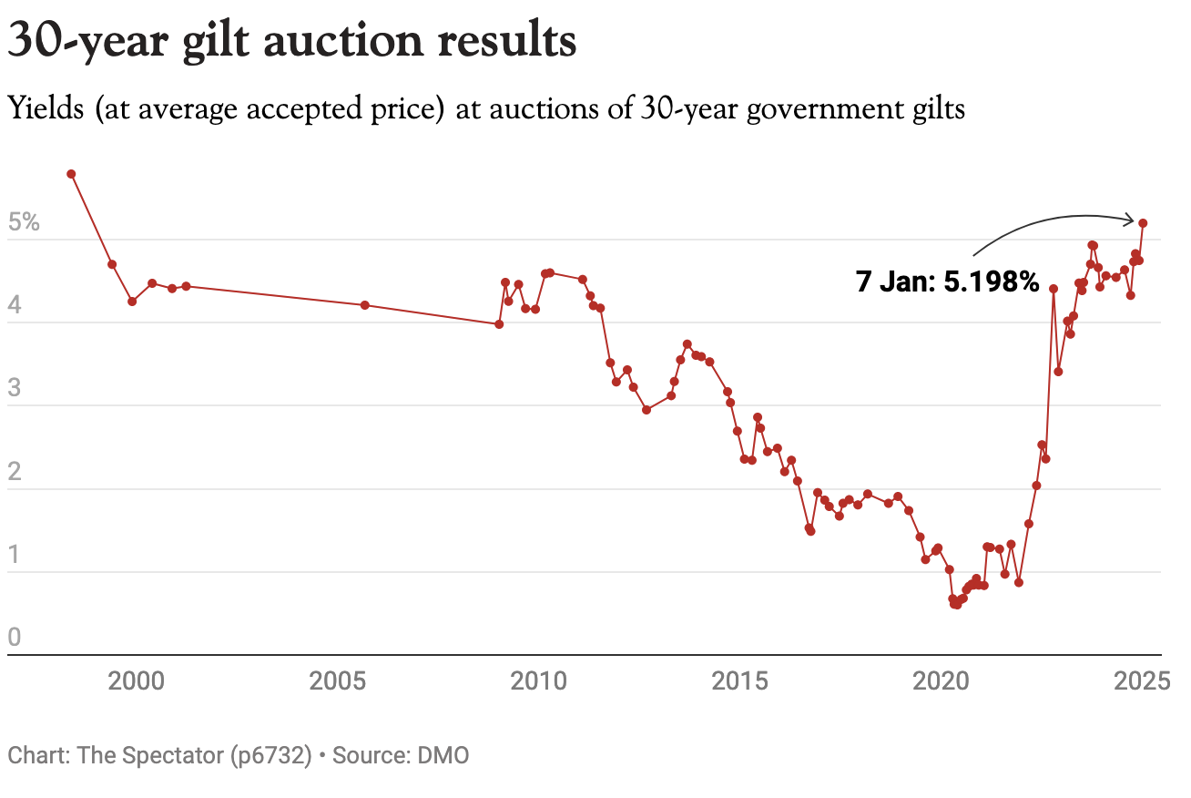 One of the factors making the markets jittery is the return of Donald Trump and what it could mean for the global economy. Even if Starmer and Reeves managed to avoid tariffs (this is no given), they face a headache on defence. As I write in this week’s politics column, Trump has said that he expects Nato members to up their spending to 5 per cent of GDP. ‘That means the realistic amount is 3 per cent at least,’ says a former defence secretary. ‘By the next Nato summit, with Trump there, it will be the main focus – and that is a nightmare for Rachel Reeves.’ As the new year gets underway, there is little for Reeves to feel positive about. Her best hope is that the bond market response will pass – and fast.