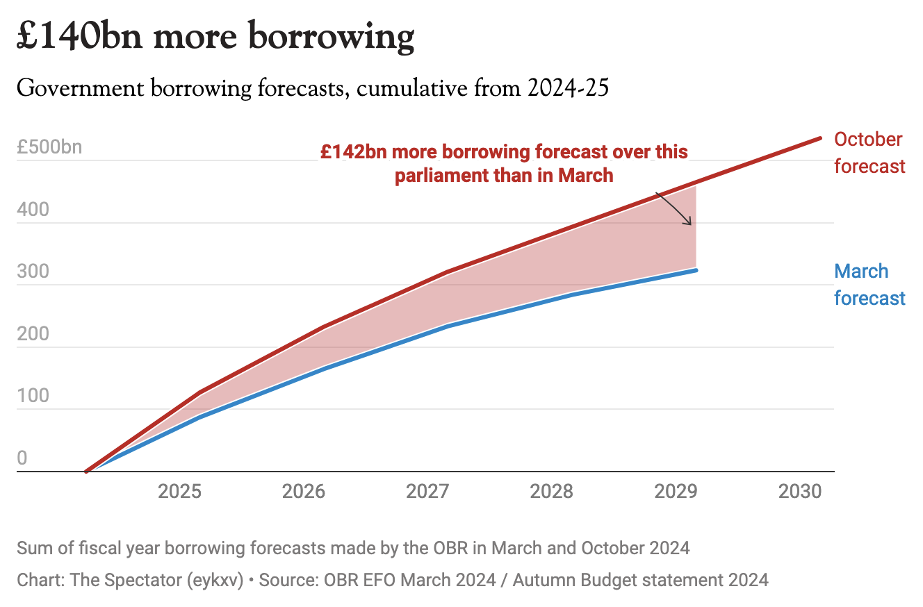 As expected, the opposition parties have been quick to go on the attack. Kemi Badenoch has called on Reeves to address parliament before she heads off to China on a charm offensive seeking closer economic ties. The shadow chancellor Mel Stride says ‘Labour’s decision to rack up higher debts is making it more expensive for the government to borrow’. In her first Budget as Chancellor, Reeves changed the borrowing rules on capital spending, meaning the UK government is expected to borrow £142 billion more over the next five years than they would have otherwise.