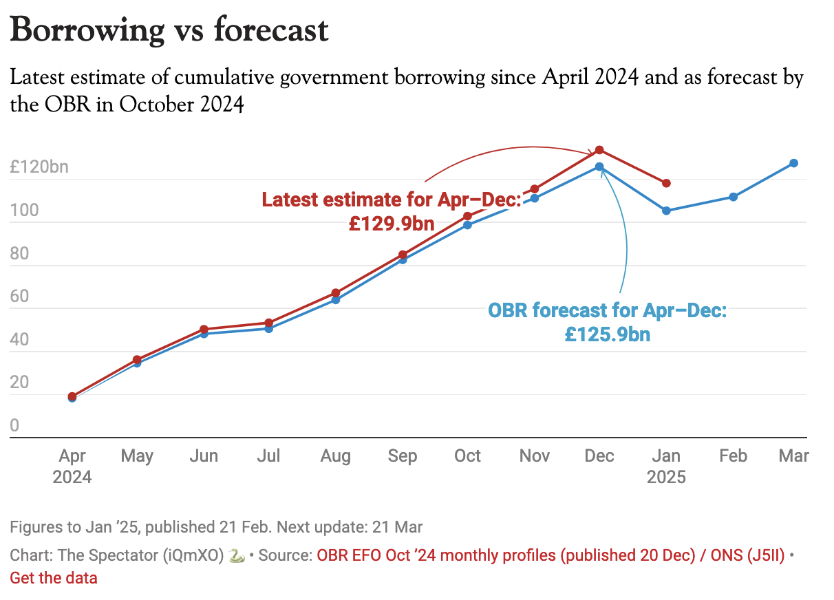 Rachel Reeves is having to borrow more money than even the worst estimates expected. Figures on the public finances, published this morning by the Office for National Statistics (ONS), show that in the financial year to January we borrowed over £118 billion. This is £11.6 billion more than at the same point in the last financial year and is the fourth highest borrowing period since comparable records began in 1993. The Office for Budget Responsibility (OBR) had expected borrowing to be some £13 billion lower by this point in the year.