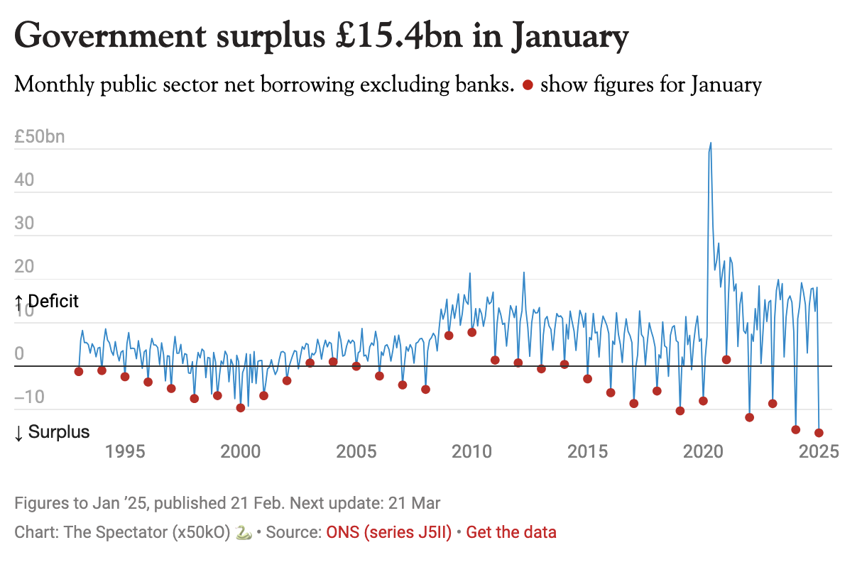 January figures usually bring good news for the Treasury as self-assessment tax returns flood in. Reeves has, as a result, experienced the largest January surplus since records began. The ONS’s figures show the public sector was in a £15 billion surplus last month – £0.8 billion larger than last year. Successive decisions to take the tax burden to its highest post-war level are reaping rewards for the Treasury as HMRC recorded some £36.2 billion in income from self-assessed and capital gains tax receipts in January. That’s nearly £4 billion more than was raised last year and the highest January tax take since records began.