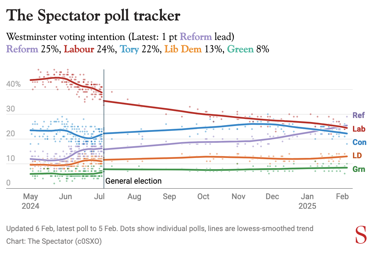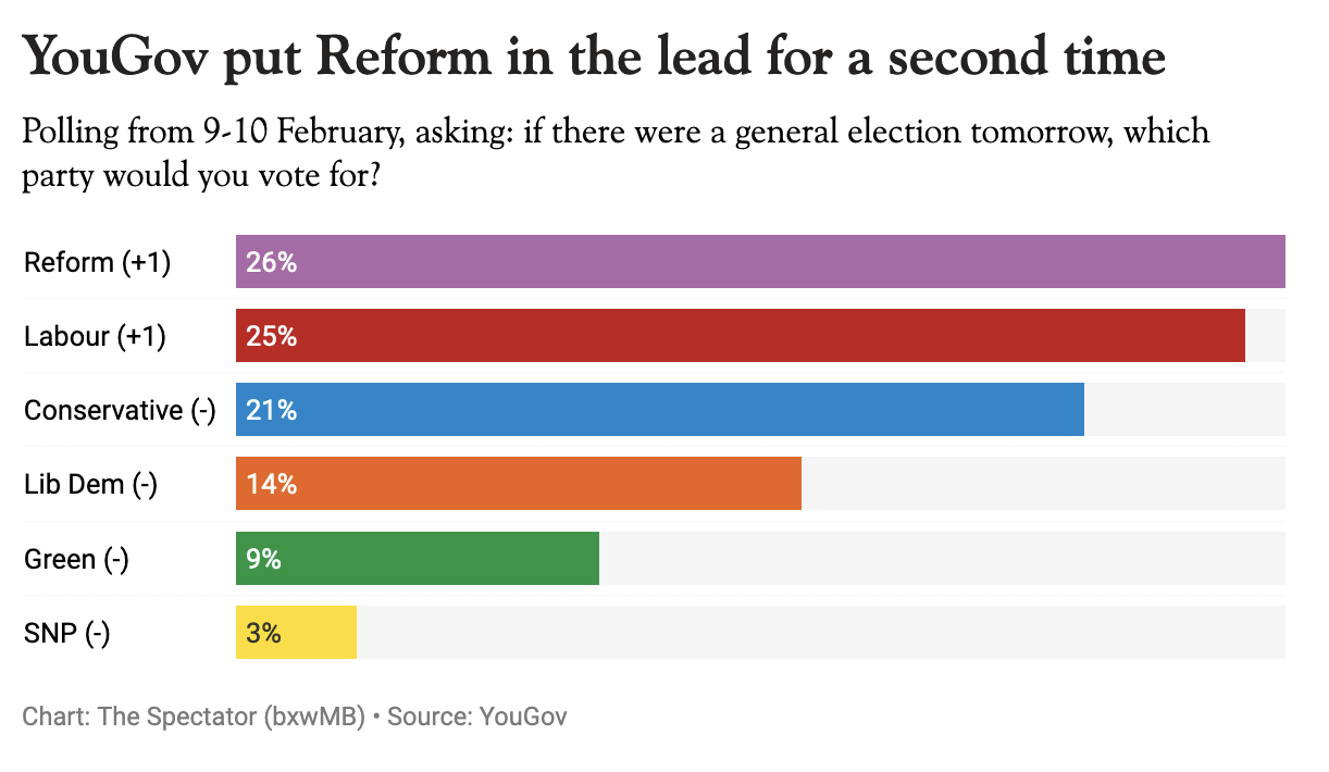 As for Reform, this latest results follows surveys published earlier this year by FindOutNow and YouGov which showed the party in first place – while last week the Spectator’s poll tracker revealed Farage’s group was now out in front of its competitors. Will this trend continue? Stay tuned…