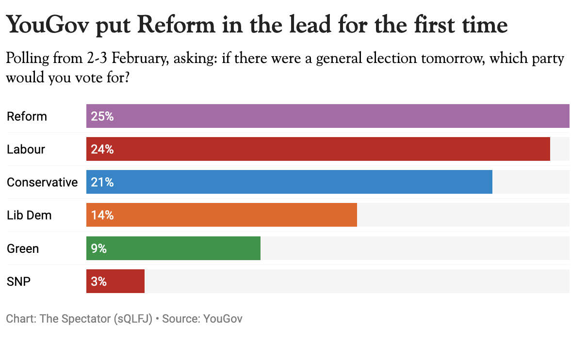 There’s reason for cheer at Reform HQ this morning: Nigel Farage’s party is leading Labour in a YouGov voting intention poll for the first time. According to the poll, Reform UK leads on 25 points with Labour in second place on 24 per cent and the Conservatives in third on 21 per cent. Meanwhile, the Liberal Democrats are on 14 per cent and the Greens on 9 per cent. While there have been a handful of polls to date putting Reform in the lead, they have so far been regarded as outliers. In response to the poll, Richard Tice, the deputy leader of Reform, said: ‘Much more to come as common sense policies welcomed to save Britain and make us better off’.
