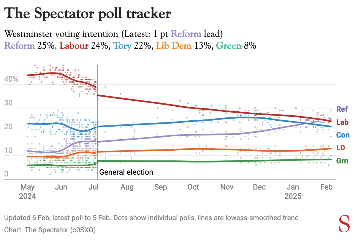 Nigel Farage’s Reform party are now out in front at the top of The Spectator data hub’s poll tracker. The latest update to our poll of polls puts Reform one point above Labour – on average – at 25 per cent of the vote with the Tories in third place at 22 per cent.
