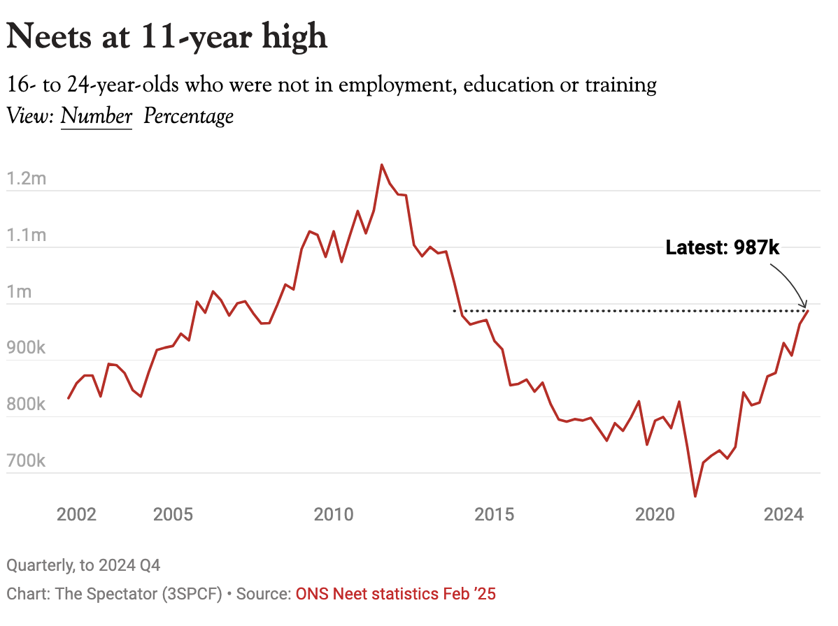 The number of young people not doing anything with their lives has hit its highest level in 11 years. Figures released this morning by the Office for National Statistics (ONS) on 16- to 24-year-olds not in education, employment or training – so-called NEETs – show that the number has reached just under one million in the last three months of 2024. Standing at 987,000, the number of NEETs is up by 110,000 since the end of 2023 – equivalent to a town the size of Oldham.