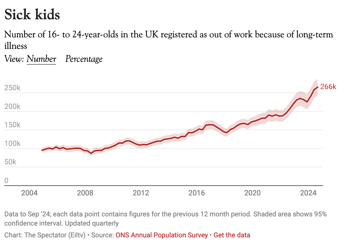 Some blame the rise in mental health conditions for the increase in young people living idle lives. Almost one in five young adults has a mental health condition and, as I reported last month, there has been an alarming rise in mental health problems among children. A fifth of eight- to 16-year-olds are experiencing a probable mental health disorder – up 125 per cent.