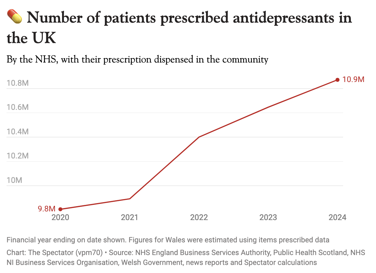 Others fear that GPs are too quick to diagnose mental health conditions and dish out antidepressants. As the graph below shows, the number of patients (of all ages) prescribed antidepressants in the UK has shot up in recent years.