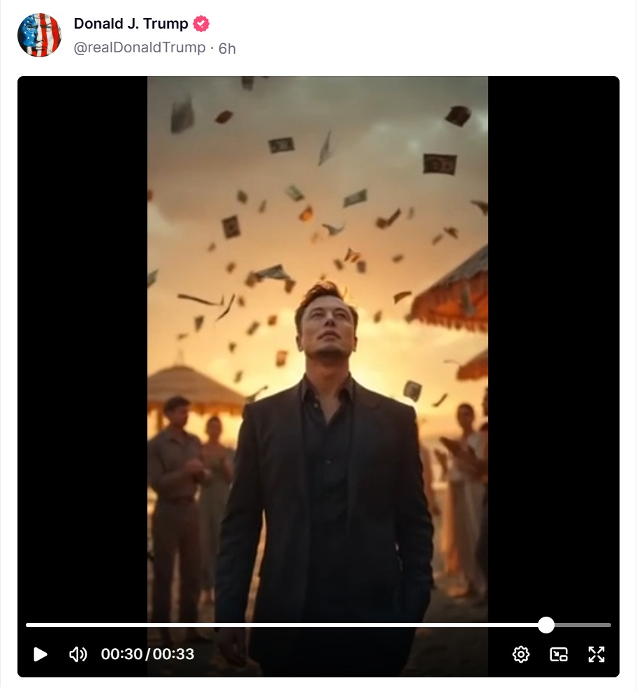 Finally, it should be pointed out that Trump did not make the AI video. There have been many AI videos of Trump and Elon, especially in the lead-up to the election. My personal favourite featured the pair dancing to a Bee Gees song.