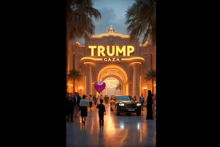 He posted a short AI video to Truth Social depicting ‘TRUMP GAZA’ replete with money raining down over a Gazan beach, children holding hands, super-yachts in the harbour, a towering golden statue of Trump in the town square, Trump-themed merchandise lining street stalls, bearded women dancing (oh yes), a Trump Gaza hotel lit up in neon, and a parting shot of swimwear-clad Trump and Bibi sipping drinks on the beach.