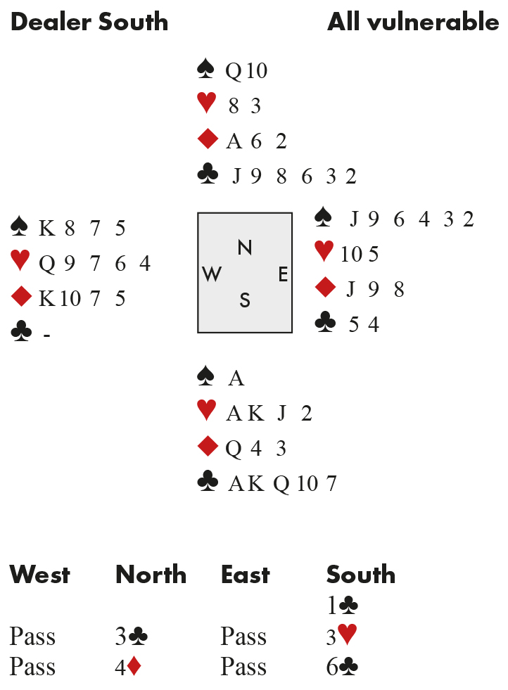 Michal in the South seat found out that partner had long Clubs and a card in Diamonds, and bid the slam.