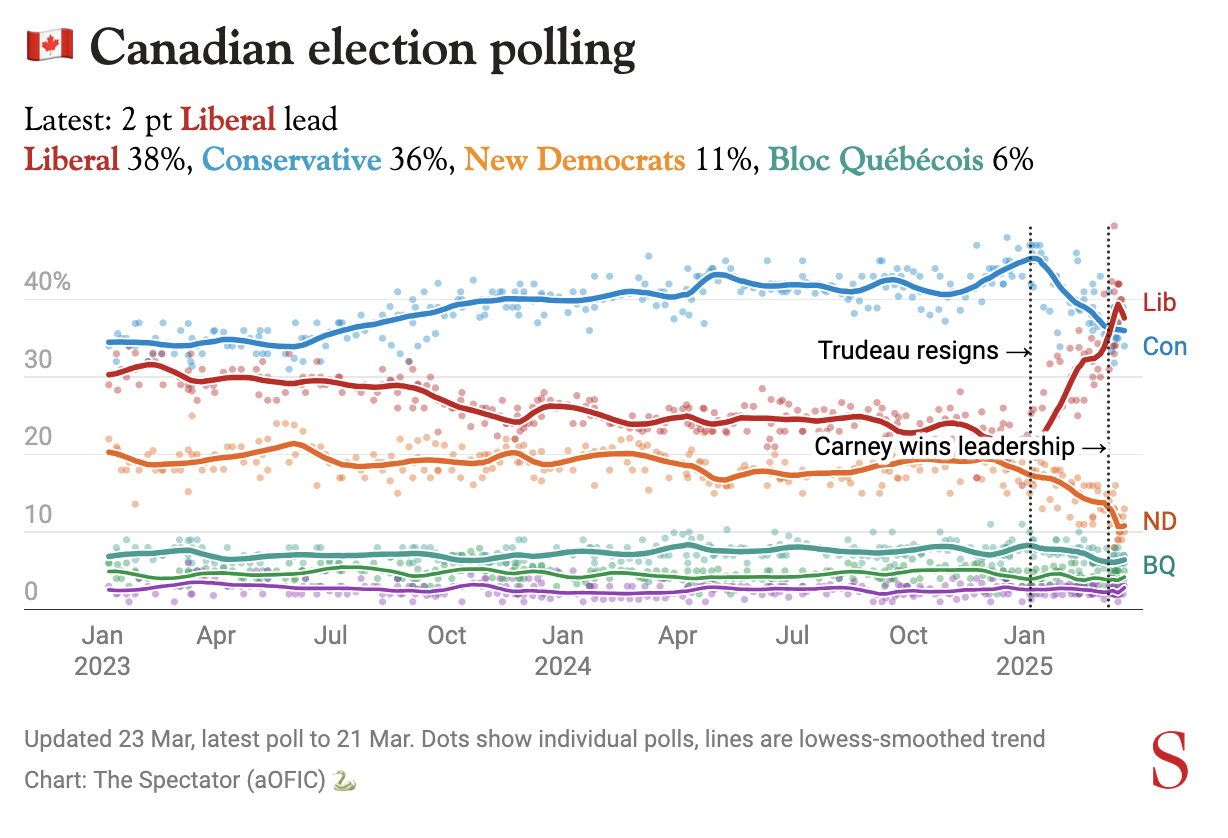 Playing the patriotism card is a strategy which has worked well for Carney’s party thus far. Since January, the Liberals have made an extraordinary comeback in the polls: thanks partly to Trudeau’s exit from the scene but mainly due to the ‘rally around the flag effect’ prompted by Trump’s threats. Carney, with his past stewardship of the central banks of London and Ottawa, is keen to trade on his credentials as a statesman: the trappings of office have been exploited to the full during his brief premiership so far.