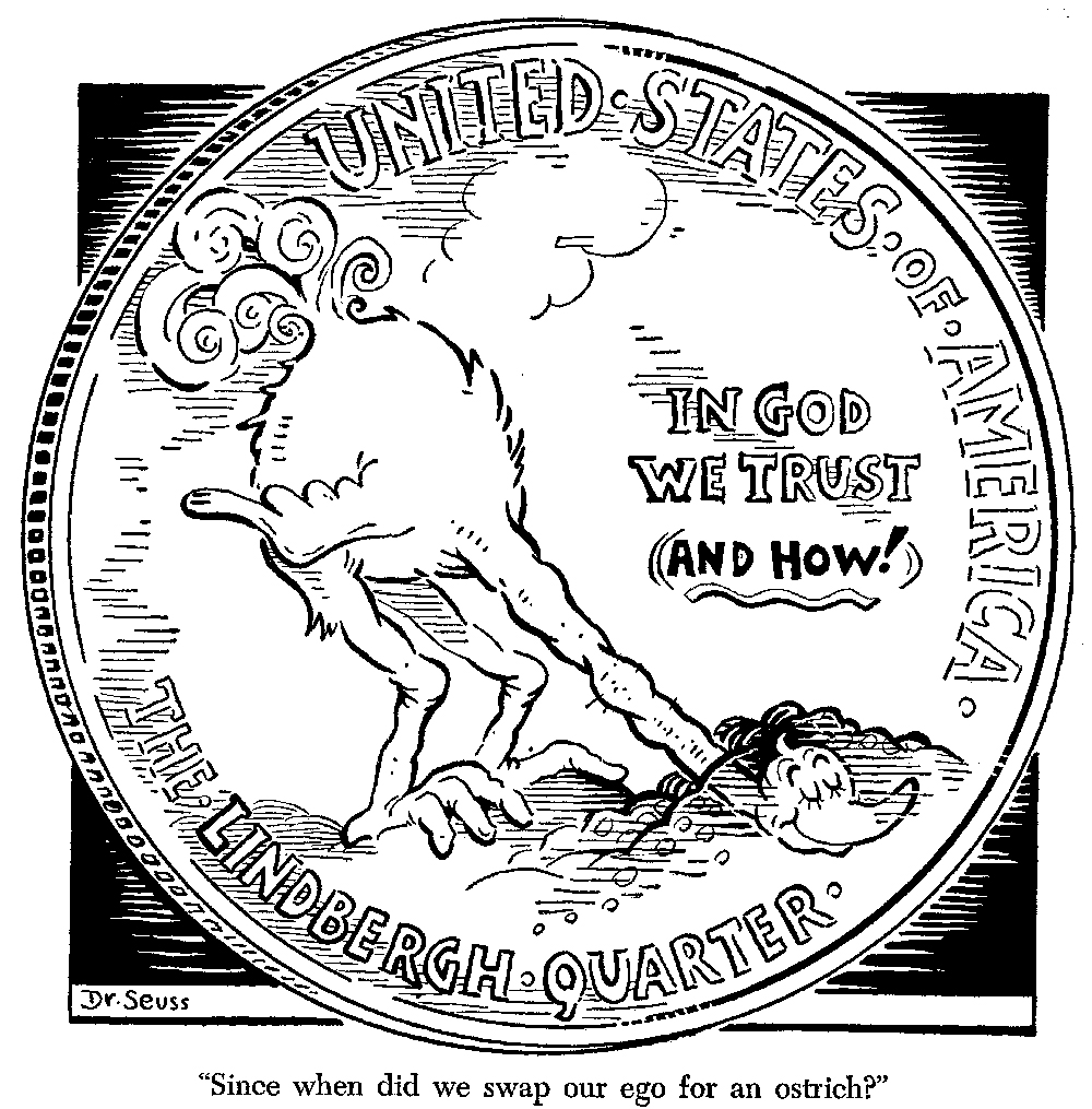 Long before the Cat donned his Hat and the Grinch stole Christmas, Dr Seuss – real name Theodor Seuss Geisel – was a political cartoonist. He produced some 400 drawings for the liberal New York paper PM and was a vociferous critic of America’s reluctance to engage with the fascist menace in Europe. He was particularly critical of Lindbergh – an aviator hero, appeaser and possible Nazi sympathiser – whom he often depicted as an ostrich called ‘Lindy’.