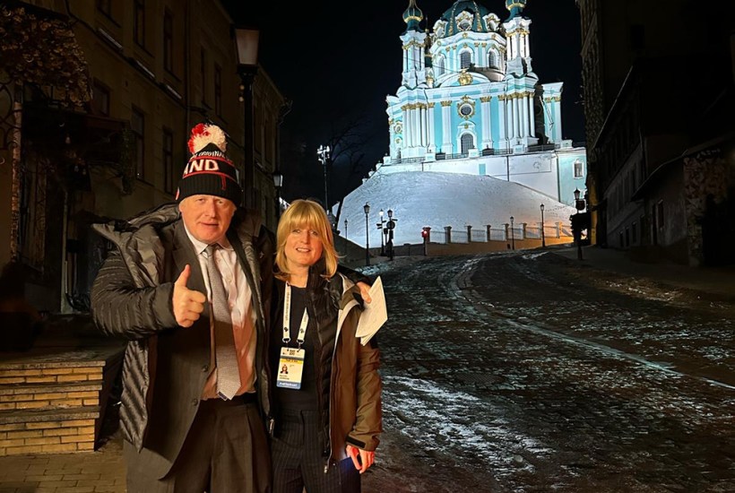 My cabin-mate was battle-hardened Dame Shelley Williams-Walker, formerly at No. 10, now Boris’s press agent, travel agent and personal organiser. She is also a lethally effective bouncer, I found, as people can crowd him for selfies. Especially here. Big in Ukraine. Not a lot of people know this but here croissants are confected with messy yellow icing in his honour, streets are renamed Boris Johnson Street (in a town near Odessa) and there’s even a pub in Kyiv with murals of, yes, you guessed.