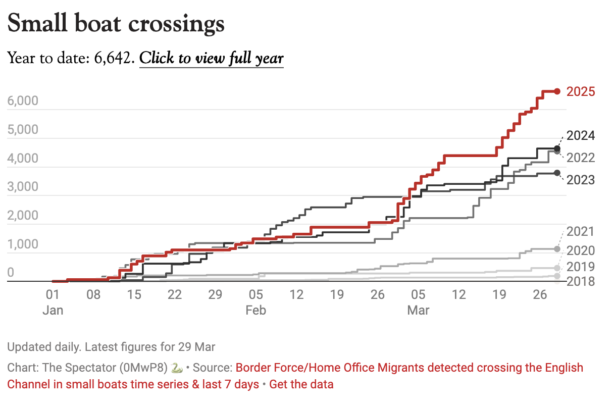 The British weather is improving – and that is bad news for Labour’s migration efforts. For the past five years, the beginning of spring has coincided with an uptick in Channel crossings; ministers expect the same again this summer. It is a phenomena that has reduced a succession of Home Secretaries to little more than weathermen; Yvette Cooper this weekend blamed sunnier conditions for the record number of arrivals this year. So far, 6,632 migrants have reached the UK since January, up from 4,600 at the same point in 2024. The small boats are no longer even that small: people smugglers are now favouring larger vessels, with 98 people crammed into one craft last year.