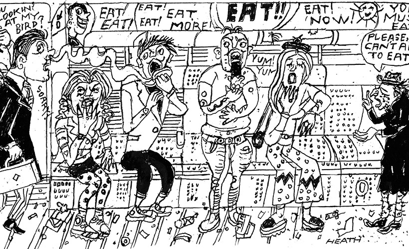 I’m on the 10.45 slow train to Ipswich. It’s not even lunchtime, yet everyone around me is already gorging on food. The corpulent man opposite is posting fistfuls of cheesy Doritos into his gaping maw, washing them down with cheap lager. A woman is noisily chomping her way through a limp burger that reeks of dirty vegetable oil. On my right, I’m greeted by the unmistakable whiff of Greggs meat pie, an unholy stench best described as ‘care-home carpet’.