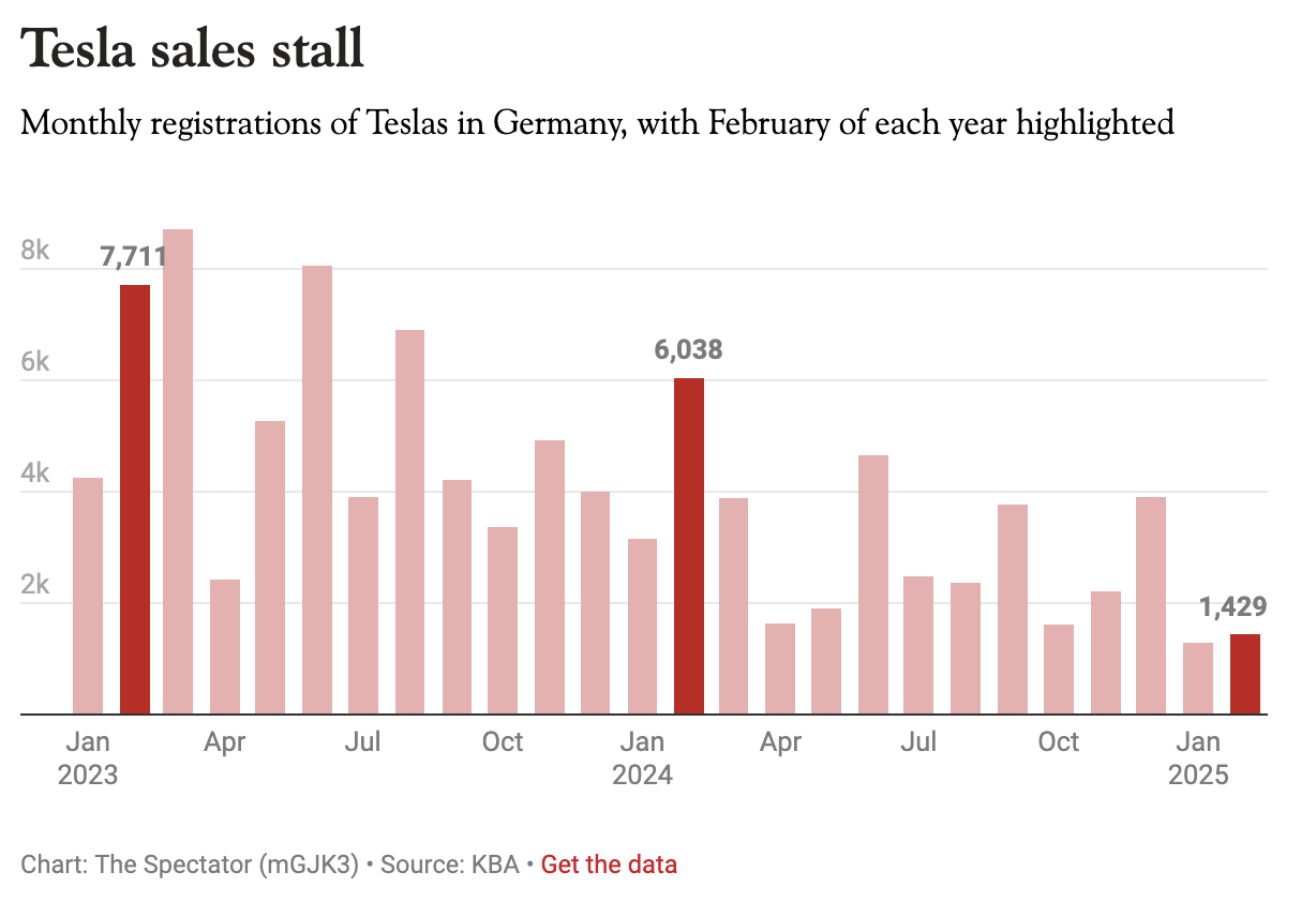 European Tesla sales have plummeted since Donald Trump’s election victory brought Elon Musk into government as axeman-in-chief. Nowhere has the plunge been more precipitous than in Germany, where sales fell 60 per cent in January and a further 76 per cent in February – when just 1,429 Teslas were sold. Existing Tesla owners, too, appear to be dumping their vehicles prematurely. In Britain, the prices of a one-year-old Tesla are reported to be 21 per cent lower than at the same time last year (that’s the price of a 2024 model Tesla in 2025 compared with the price of a 2023 model in 2024).