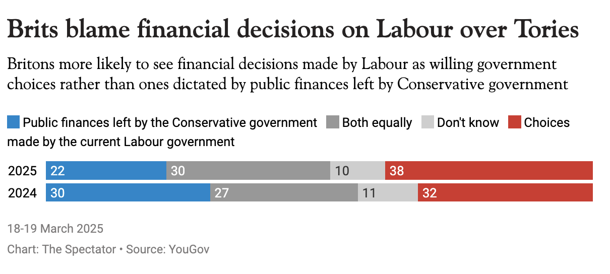 Tick tock. There are less than 48 hours to go until Rachel Reeves’s big Spring Statement on Wednesday and as the Treasury finalises its preparations for the big reveal, YouGov has been running some tax-related tests of its own. In a blow for the reds, the polling company has found that it is becoming more difficult for the Labour lot to blame the Tories for its tax and spend decisions – with an increasing number of people seeing Sir Keir Starmer’s government as responsible for tough tax calls.