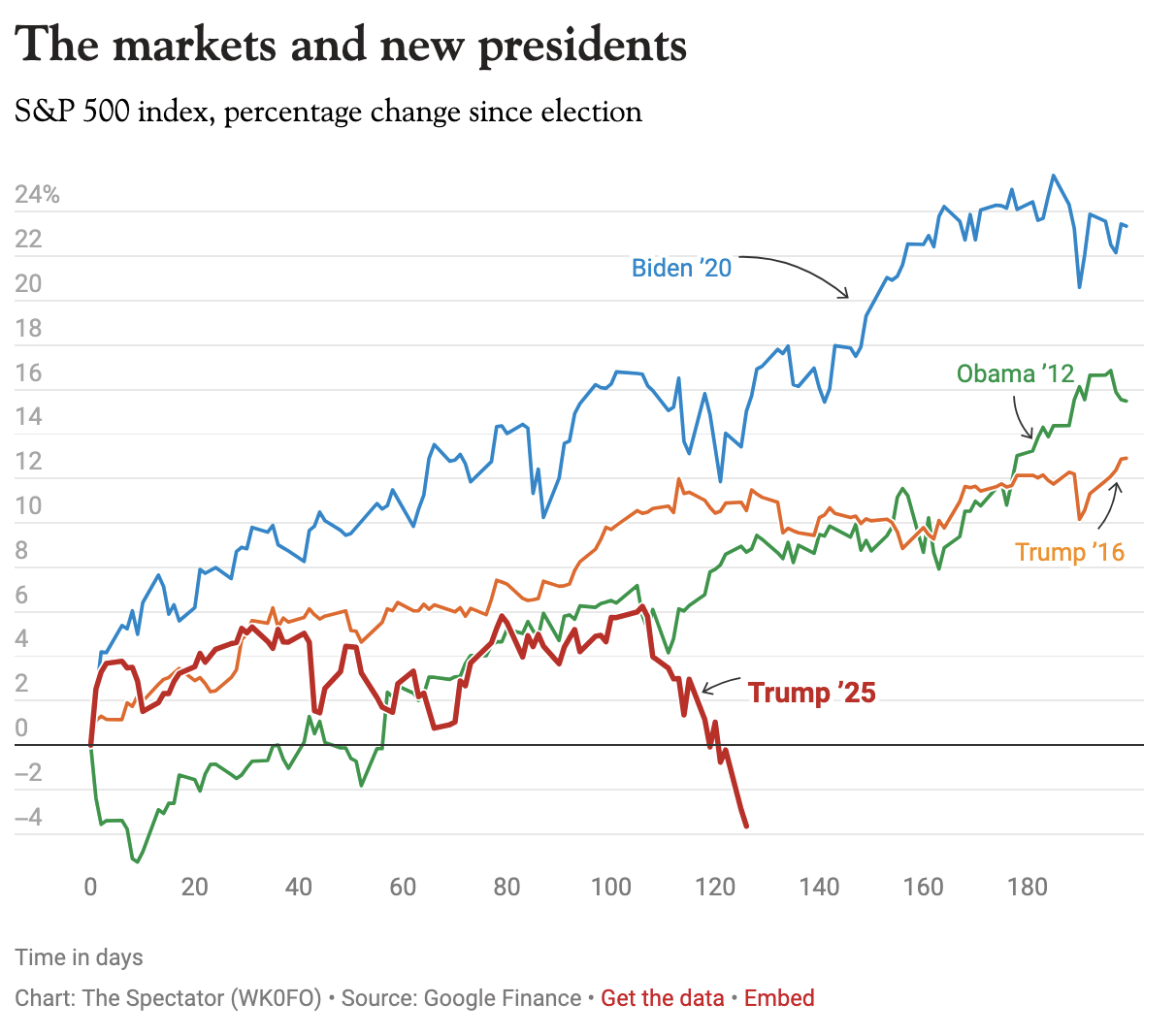 Markets are not enjoying Donald Trump’s tariffs. Some 125 days have passed since his second election victory and the S&P 500 is on a clear downward trajectory thanks to Trump’s tariff policies and other poor US economic data. After the same number of days following Biden’s election, the S&P was up 13 per cent; for Obama’s second term it was up nine per cent; and at the same point in Trump’s first presidency it was up 11 per cent. For Trump 2.0 it’s down 3 per cent from election day.