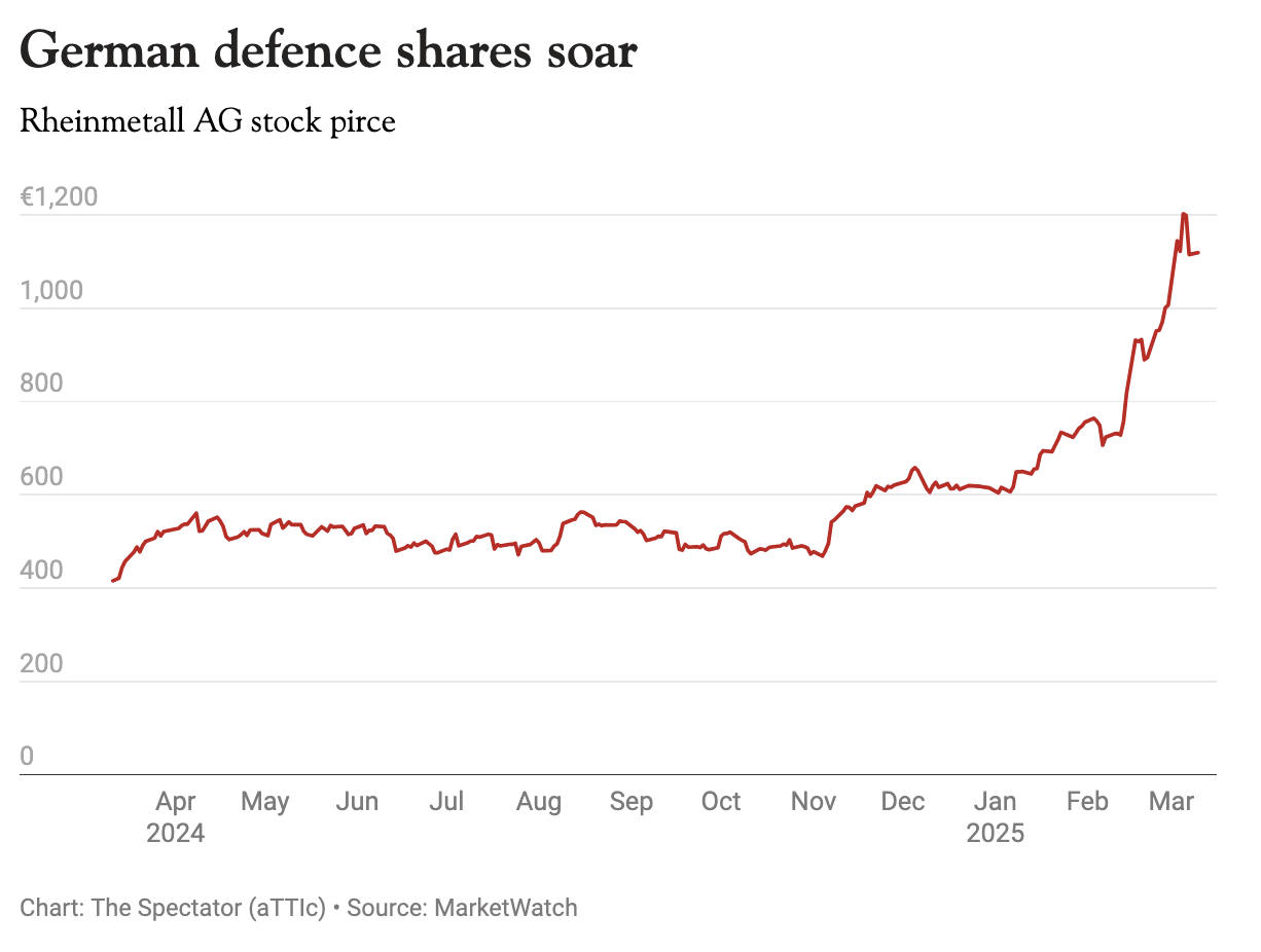In Europe defence stocks have soared thanks to the dawning reality that European nations are going to have to fund much more of their own defence. Starmer has cut the foreign aid budget to fund a modest spending increase here, while Germany has committed to finding a way to unlock hundreds of billions of euros for rearmament. Shares of German arms maker Rheinmetall are up 93 per cent since the start of the year to a record high valuation and as Bloomberg points out, that makes the tanks and bullets manufacturer more valuable as a multiple of its earnings than the luxury LVMH group.