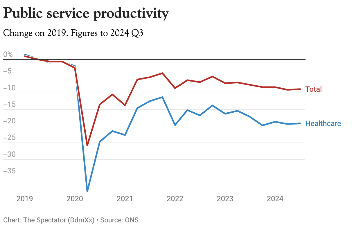 Giving evidence to the Treasury Select Committee this afternoon, Bank of England Governor Andrew Bailey doubled down on a point he has previously made to the committee: the economy is being pulled down by an extraordinary fall in productivity in the public sector. Relative to 2019, he said, productivity across the public sector is now 8 to 9 per cent lower. In the health sector, it is 17 to 18 per cent lower. In what he described as a ‘back of the envelope calculation’ the overall effect has been to reduce GDP by between 1 and 3 per cent.